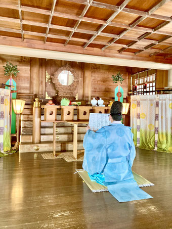拝殿に上がり、お祓いをお受けいただき、神前にて神職が祝詞を奏上し、皆様のお願いごとを神様にお伝えいたします。